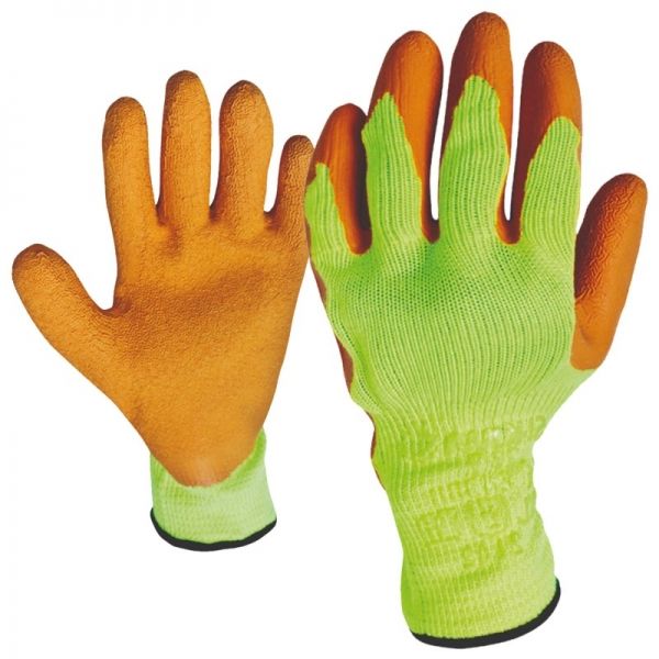 Mănuși realizate în culori reflectorizante pentru muncă intensă, palmă topită în latex, jersey fără sudură, manșetă elastică, respirabilă.