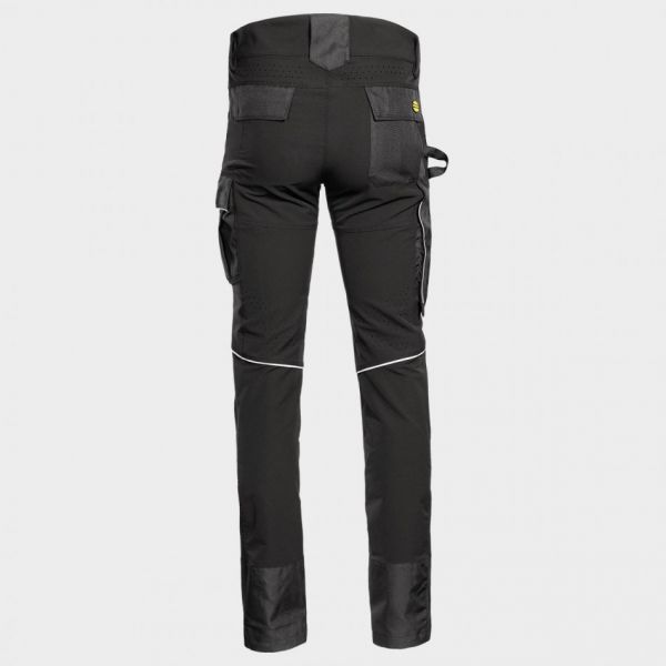 Pantaloni elastici impermeabili, curea cu detalii elastice din partea laterală pentru confort sporit și inserție în zona spatelui pentru o mai mare libertate de mișcare. Dispune de buzunare frontale deschise, un buzunar lateral dublu pentru instrumente și un buzunar pentru genunchi din material rezistent la abraziune, care se deschide din partea de sus. Caracteristicile suplimentare includ detalii reflectorizante, un nasture ascuns și un design ergonomic al picioarelor cu lungime reglabilă. MATERIAL: 54% nailon, 39% poliester, 7% elastan, 230 g/m²; genunchiere și inel pentru ciocan - 100% poliester hidrofug