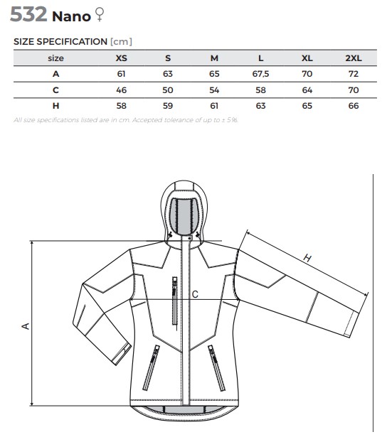 - Softshell: 96% poliester, 4% elastan (compoziția poate varia – 100% poliester), acoperire NANOtex® care previne pătrunderea apei, 280 g/m²
