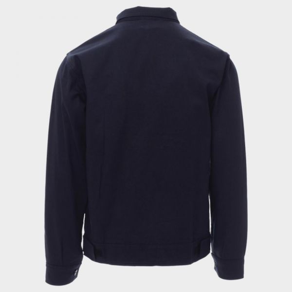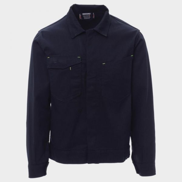 Jachetă stil denim. Închidere frontală cu nasturi din plastic ascunși. Două buzunare la piept, dintre care unul are clapă. Loc pentru smartphone, stilou și ecuson. Închidere la încheietura mâinii cu nasture și manșetă reglabilă cu velcro. MATERIAL: 100% bumbac, 260 g/m²