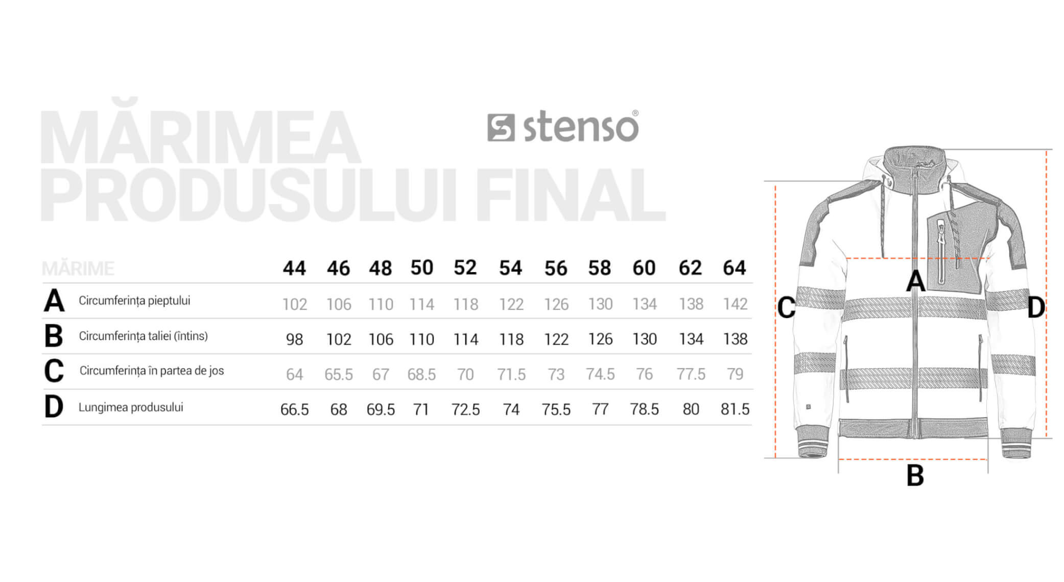 • Părți întărite și benzi reflectorizante de 5 cm lățime, câte două pe trunchi și mâneci.