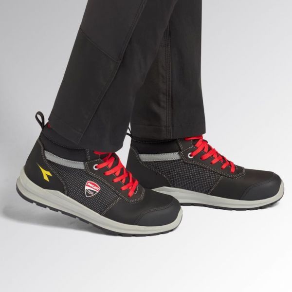 Pantofi înalți cu emblematica Ducati Corse, care combină stilul sportiv și protecția. Partea superioară robustă și talpa durabilă oferă durabilitate, în timp ce designul înalt protejează glezna în timpul muncii sau activităților active. Accentele roșii și designul modern completează aspectul atractiv.