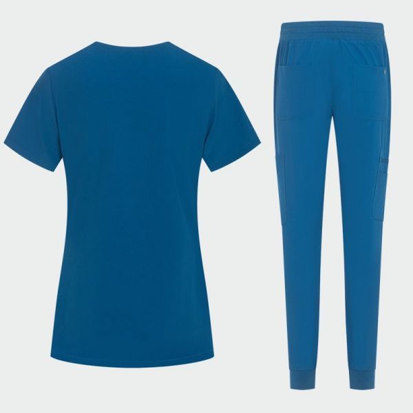 NAOMI este un set medical de damă, stilat și practic – tunică și pantalon tip „jogger”, realizat dintr-un material de înaltă calitate, care asigură confort și libertate de mișcare.