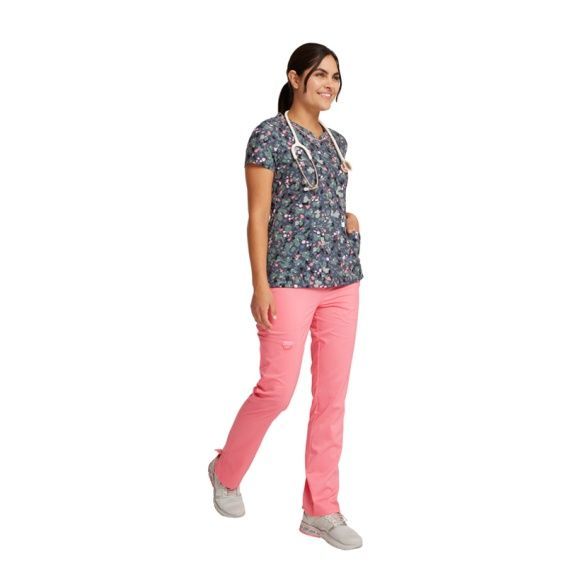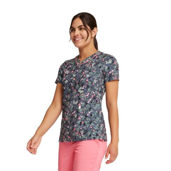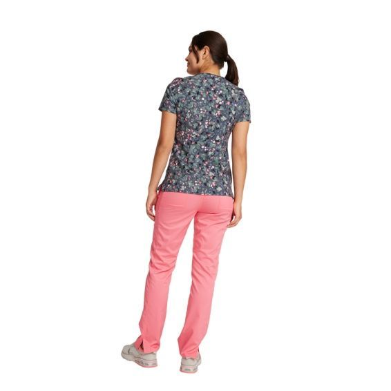 Tunica medicală de lucru GENUINE CK678 este o tunică elegantă pentru dame, marca CHEROKEE, cu croială cambrată, decolteu în V și imprimeu colorat modern. Este confecționată din 52% poliester reciclat, 40% poliester și 8% elastan, cu densitate de 175 g/m².