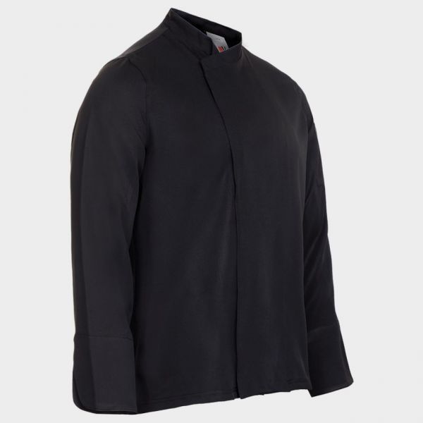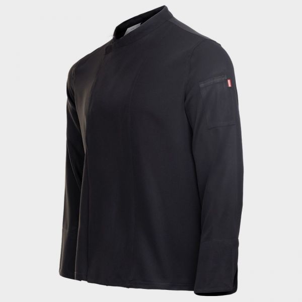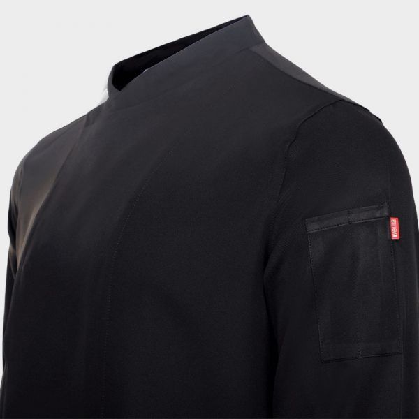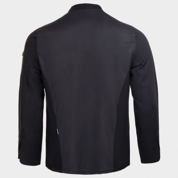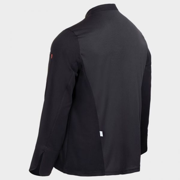• Tunică de bucătar cu mâneci lungi, închidere asimetrică cu nasturi tip capse, spate din material respirabil Coolmax.